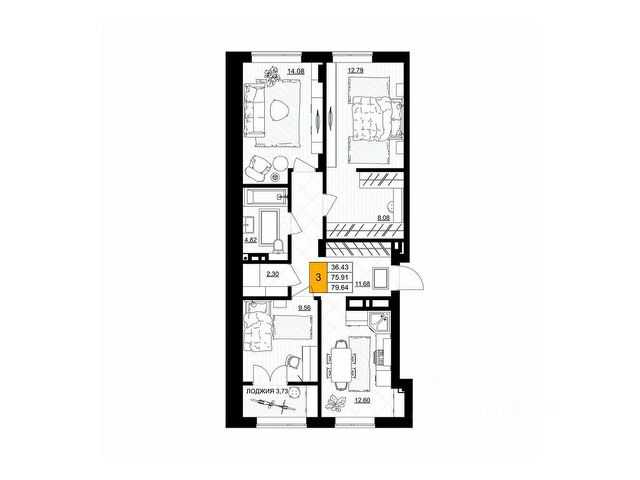 Квартира: 3 к 79,30 кв.м., 5 этаж в комплексе Включи, 1 очередь, корп.2, сдача: 4кв. , этажей: 7, адрес Гурьевск г., Героя России Катериничева ул., д. 2 корп 2, Застройщик: ССК.