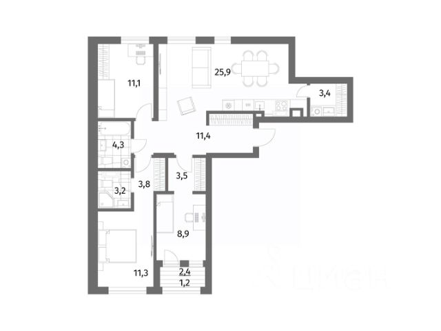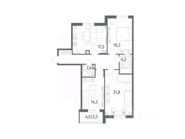 большая кухня гостиная 19,4 м.кв. с панорамным остеклением и выходом на комфортную лоджию. Это место где встречают гостей, с дополнительным спальным местом.,