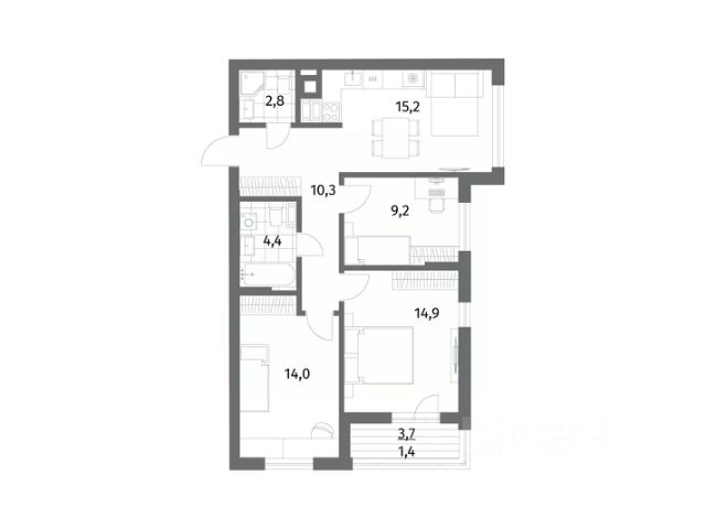 Продается квартира площадью 72.5 м² на 2 этаже 1 секции в River Park от компании ГК "ТРЕСТ". Площадь кухни 15.2 м².