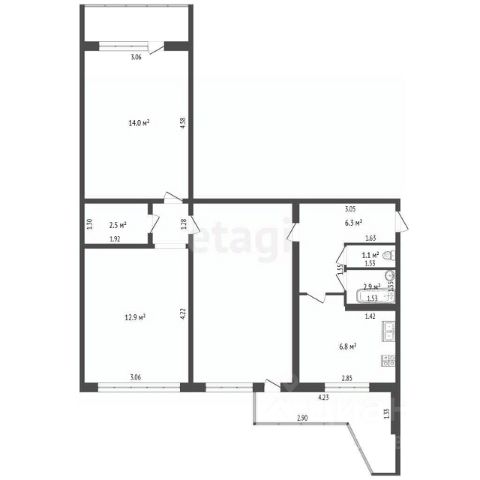 3 комнаты: 13, 14 и 14,1 м². Кухня-гостиная — 18,5 м². Холл — 13,4 м². Два санузла, кладовая, лоджия 4,5 м².