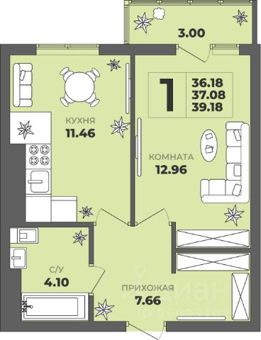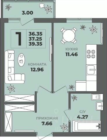 Квартира расположена на 3 этаже четырехэтажного кирпичного дома, общая площадь квартиры 35.6 кв.м, жилая 17.07 кв.м, кухня 8.88 кв.м, совмещённый санузел 4,29 кв.м. Есть балкон.