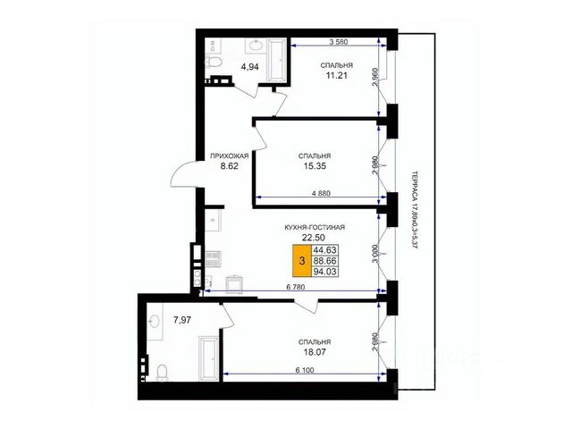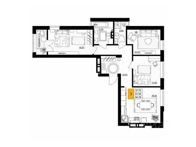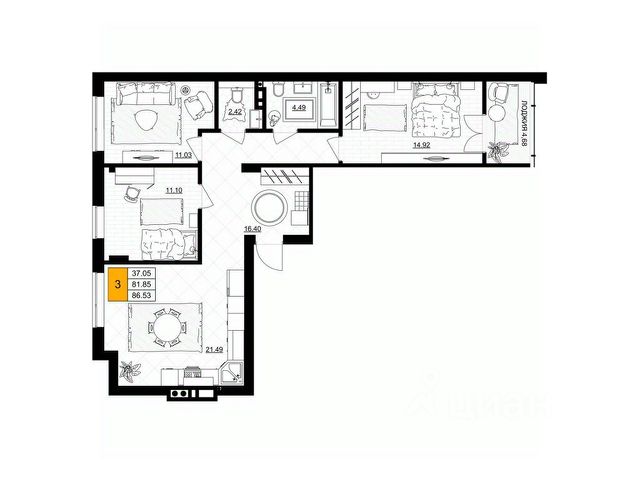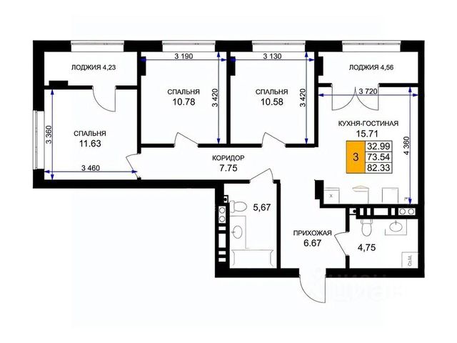 Площадь комнат 13,09+11,46+11,59 кв.м.