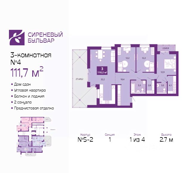 Просторная 3-комн. квартира с предчистовой отделкой в ЖК "Сиреневый бульвар" на 4 этаже. Общая площадь: 91.3 кв.м., жилая: 35.4 кв.м., площадь просторной кухни-столовой: 27.7 кв.м. Угловая квартира, идеально подойдет любителям тишины и панорамных видов. В квартире два балкона и одна лоджия, один совмещенный и один раздельный санузел. Высота потолков 2.7 м. Квартира находится в корпусе 5-2. Дом монолитный, одноподъездный, высотой 4 этажа. На этаже 4 квартиры. В подъезде 1 грузовой лифт. На сегодняшний день строительство окончено, дом сдан в 4 квартале 2025 года. Оформление сделки по договору купли-продажи. Жилой комплекс "Сиреневый бульвар" это 5 клубных 4-х этажных домов на 16 квартир и 9 домов с несколькими секциями. Вместе эти дома формируют собственное закрытое пространство с дворовыми территориями, спортивными и детскими площадками, местами отдыха и коммерческими помещениями. Дизайнерские входные группы и небольшие приусадебные участки квартир нижних этажей, обилие зелени, удобные зоны отдыха всё устроено с особым вниманием. Жителей комплекса ждут просторные квартиры комфорт-класса с огромными террасами, мастер-спальнями, гардеробными и кухнями-гостиными. В каждом доме предусмотрены места для хранения велосипедов, кладовые помещения на цокольных этажах. "Сиреневый Бульвар" позволит своим жителям получить все преимущества городского комфорта и максимум плюсов от жизни на природе. Для жителей и гостей предусмотрены парковочные места, вся территория оборудована круглосуточной системой видеонаблюдения. В шаговой доступности находятся детский сад, начальная школа и продовольственные магазины. Жилой Комплекс "Сиреневый Бульвар" - уникальный проект, расположенный в Калининграде - балтийской жемчужине, в городе с богатым прошлым, комфортным настоящим и радужным будущим. Именно Калининград место встречи России и Европы. Жилой Комплекс "Сиреневый Бульвар" находится в географическом центре города. Ленинградский район (бывшие Ротенштейн, Марауненхоф, Лип, Девау, Палве и Куммерау) это северная часть Калининграда, где в довоенные годы располагался Старый город. Жилой комплекс находится рядом с Верхним озером, Нижним прудом и ещё 12 городскими водоемами. Территория всего проекта занимает 21,9 гектаров и находится между улицами Арсенальная, Пехотная и 4-ой Большой окружной. Аккредитация в банках: "Сбербанк России", ПАО Банк "ВТБ", ПАО "Газпромбанк", ПАО Банк "ФК Открытие", ПАО "Промсвязьбанк". #Z6Zw1g Продам 3-комнатную квартиру элитные в Калининграде.