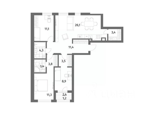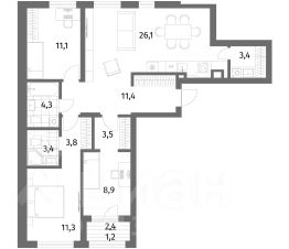 Продается квартира площадью 88.4 м² на 2 этаже 1 секции в River Park от компании ГК "ТРЕСТ". Площадь кухни 26.1 м².