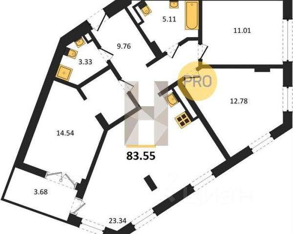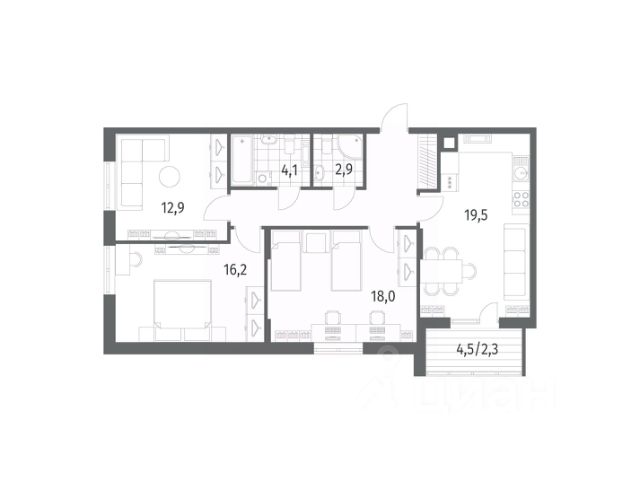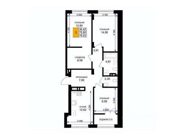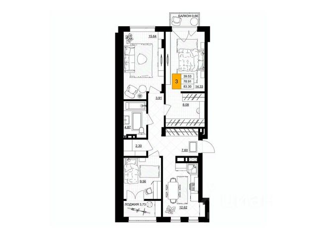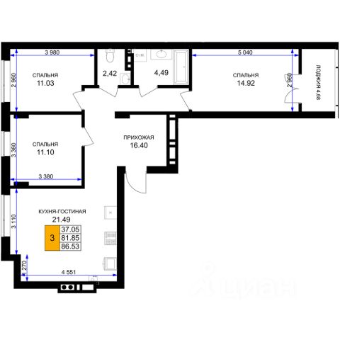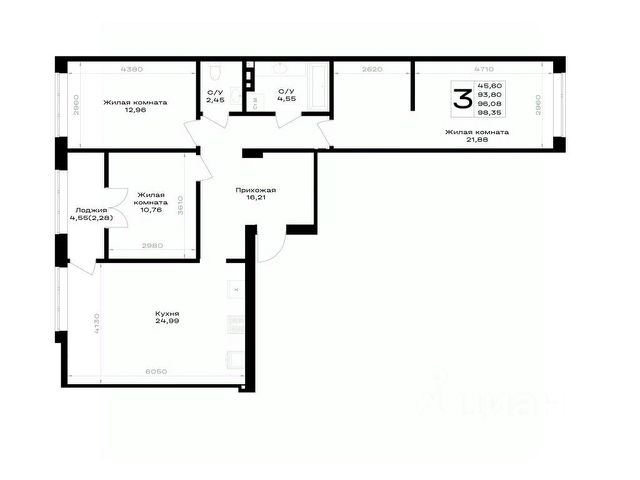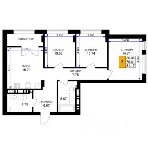 Общая площадь квартиры составляет 54,6 кв м: три комнаты - 13,3, 11,1 и 8,6 кв м, кухня 8,6 кв. м, холл 8,0 кв м, раздельный с/у, застеклённая лоджия 2,7 кв м.