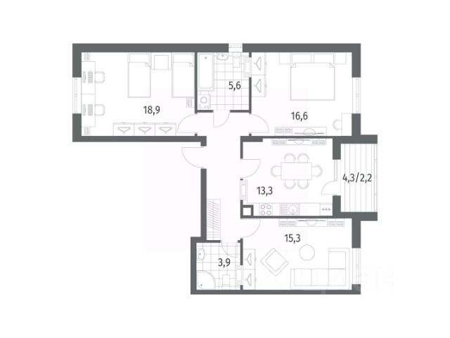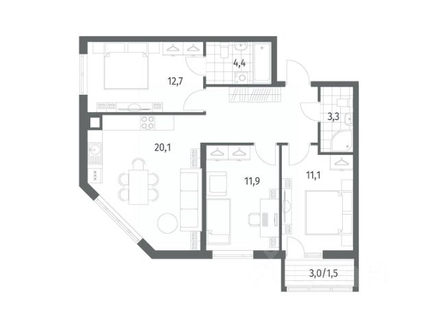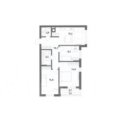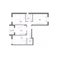 Общая площадь квартиры составляет 54,6 кв м: три комнаты - 13,3, 11,1 и 8,6 кв м, кухня 8,6 кв. м, холл 8,0 кв м, раздельный с/у, застеклённая лоджия 2,7 кв м.
