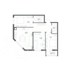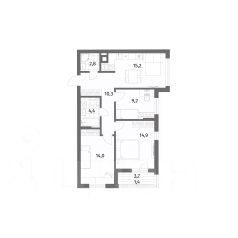 Общая площадь квартиры составляет 54,6 кв м: три комнаты - 13,3, 11,1 и 8,6 кв м, кухня 8,6 кв. м, холл 8,0 кв м, раздельный с/у, застеклённая лоджия 2,7 кв м.