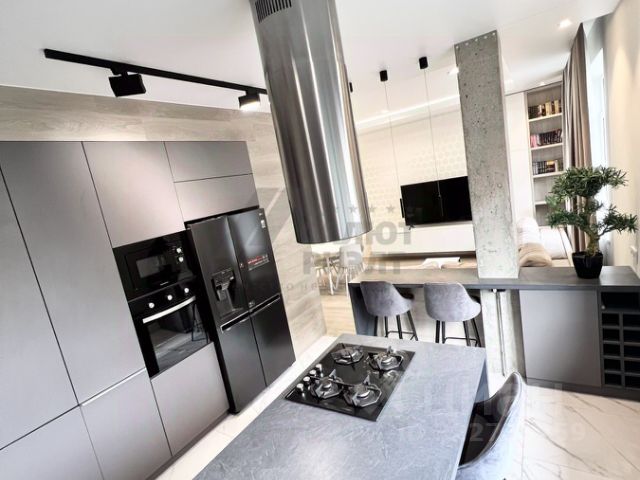 Вся техника остаётся: посудомоечная машина, встроенный холодильник, микроволновая печь, духовой шкаф, индукционная варочная панель