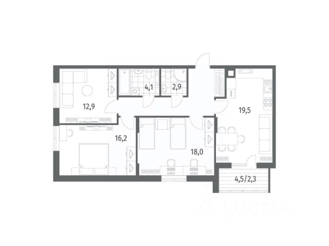 Продается квартира площадью 73.5 м² на 1 этаже 1 секции в River Park от компании ГК "ТРЕСТ". Площадь кухни 20.1 м².