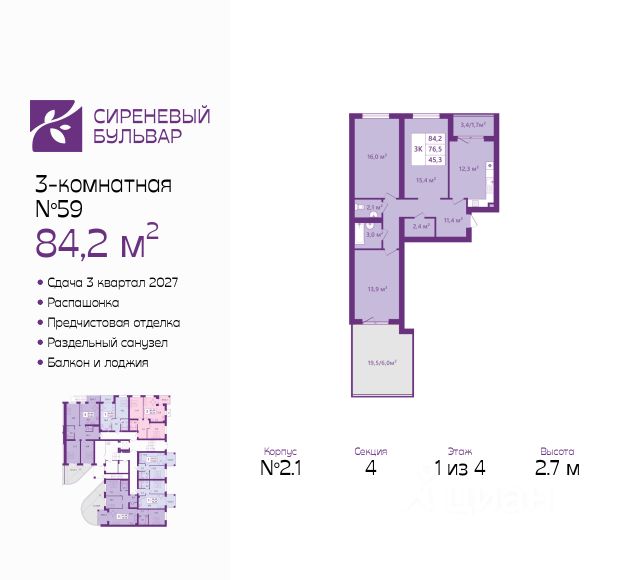 Просторная 3-комн. квартира с предчистовой отделкой в ЖК "Сиреневый бульвар" на 3 этаже. Общая площадь: 73.6 кв.м., жилая: 35 кв.м., площадь просторной кухни-столовой: 16.3 кв.м. Комнаты изолированные, все окна выходят на одну сторону. В квартире один балкон, один совмещенный и один раздельный санузел. Высота потолков 2.7 м. Дом монолитный, многоподъездный, высотой 4 этажа. Квартира находится в 8-й секции в корпусе 2.1. На этаже 3 квартиры. В подъезде 1 грузовой лифт. Окончание строительства - 3 квартал 2027 года. Оформление сделки по договору долевого участия. Жилой комплекс "Сиреневый бульвар" это 5 клубных 4-х этажных домов на 16 квартир и 9 домов с несколькими секциями. Вместе эти дома формируют собственное закрытое пространство с дворовыми территориями, спортивными и детскими площадками, местами отдыха и коммерческими помещениями. Дизайнерские входные группы и небольшие приусадебные участки квартир нижних этажей, обилие зелени, удобные зоны отдыха всё устроено с особым вниманием. Жителей комплекса ждут просторные квартиры комфорт-класса с огромными террасами, мастер-спальнями, гардеробными и кухнями-гостиными. В каждом доме предусмотрены места для хранения велосипедов, кладовые помещения на цокольных этажах. "Сиреневый Бульвар" позволит своим жителям получить все преимущества городского комфорта и максимум плюсов от жизни на природе. Для жителей и гостей предусмотрены парковочные места, вся территория оборудована круглосуточной системой видеонаблюдения. В шаговой доступности находятся детский сад, начальная школа и продовольственные магазины. Жилой Комплекс "Сиреневый Бульвар" - уникальный проект, расположенный в Калининграде - балтийской жемчужине, в городе с богатым прошлым, комфортным настоящим и радужным будущим. Именно Калининград место встречи России и Европы. Жилой Комплекс "Сиреневый Бульвар" находится в географическом центре города. Ленинградский район (бывшие Ротенштейн, Марауненхоф, Лип, Девау, Палве и Куммерау) это северная часть Калининграда, где в довоенные годы располагался Старый город. Жилой комплекс находится рядом с Верхним озером, Нижним прудом и ещё 12 городскими водоемами. Территория всего проекта занимает 21,9 гектаров и находится между улицами Арсенальная, Пехотная и 4-ой Большой окружной. Аккредитация в банках: ПАО "Газпромбанк", "Сбербанк России", ПАО Банк "ВТБ", ПАО Банк "ФК Открытие", ПАО "Промсвязьбанк". #2mfS0Z Купить 3-комнатную квартиру в монолитном доме в Калининградской области.