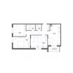 Общая площадь квартиры составляет 54,6 кв м: три комнаты - 13,3, 11,1 и 8,6 кв м, кухня 8,6 кв. м, холл 8,0 кв м, раздельный с/у, застеклённая лоджия 2,7 кв м.