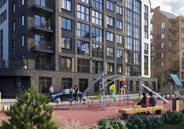 На новые современные дома, спортивное поле с футбольной площадкой, детский городок. Никаких унылых промзон — только эстетика.