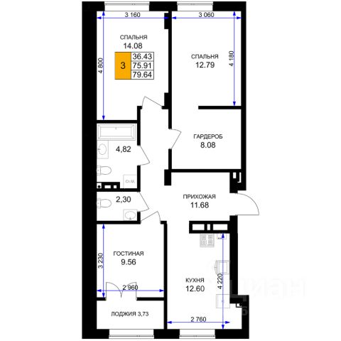 Продается квартира площадью 75.9 м² на 2 этаже 2 секции в River Park от компании ГК "ТРЕСТ". Площадь кухни 14 м².