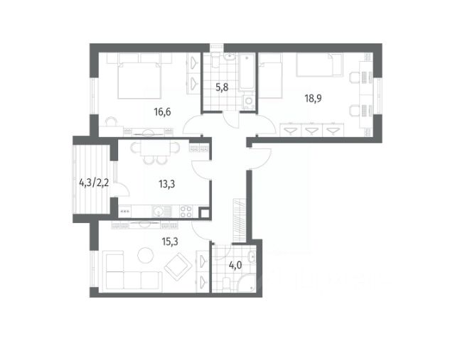Продается квартира площадью 92.8 м² на 3 этаже 1 секции в River Park от компании ГК "ТРЕСТ". Площадь кухни 17.3 м².