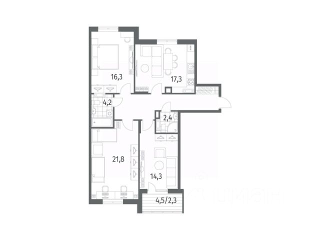 Квартира: 3 к 85,96 кв.м., 7 этаж в комплексе Включи, 4 очередь, корп.7, сдача: 1кв. , этажей: 7, адрес Гурьевск г., Героя России Катериничева ул., , Застройщик: ССК. Номер в базе: J31257L26598