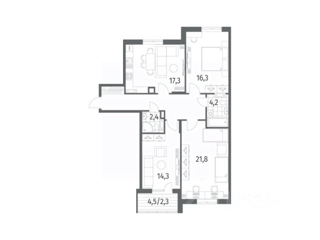 Продается квартира площадью 91.4 м² на 4 этаже 4 секции в River Park от компании ГК "ТРЕСТ". Площадь кухни 17.3 м².