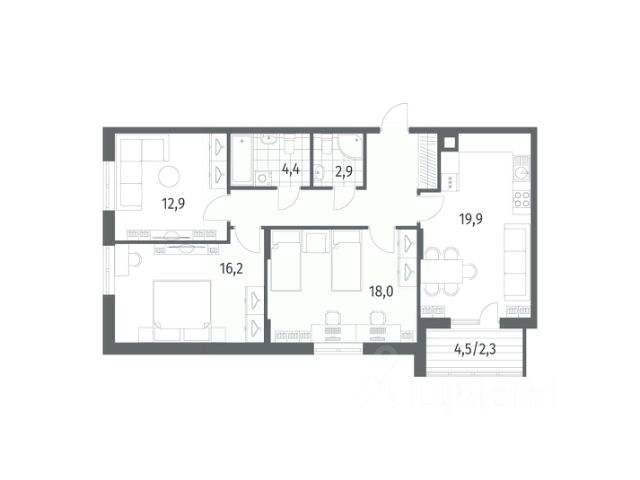 Продается квартира площадью 86.4 м² на 2 этаже 4 секции в River Park от компании ГК "ТРЕСТ". Площадь кухни 19.9 м².