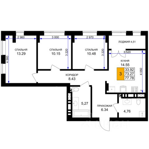 Общая площадь квартиры составляет 54,6 кв м: три  комнаты - 13,3, 11,1 и 8,6 кв м, кухня 8,6 кв. м, холл 8,0 кв м, раздельный с/у, застеклённая лоджия 2,7 кв м.