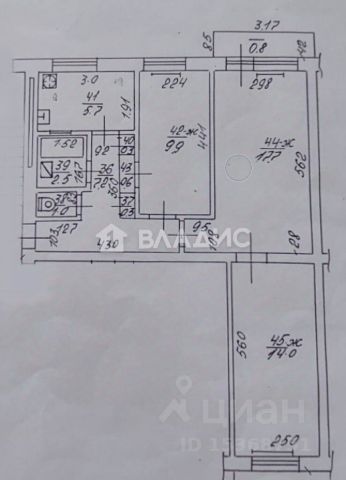 Общая площадь 74 кв.м: комнаты 13,1+22+14,3 кв.м., кухня 7,1 кв.м, санузел 1,1 кв.м и ванная комната 4,1 кв.м.