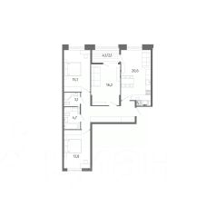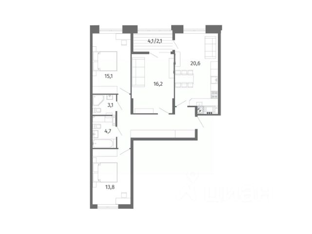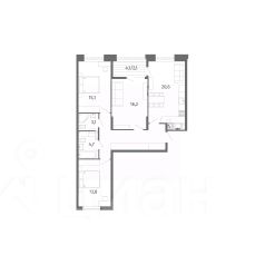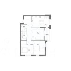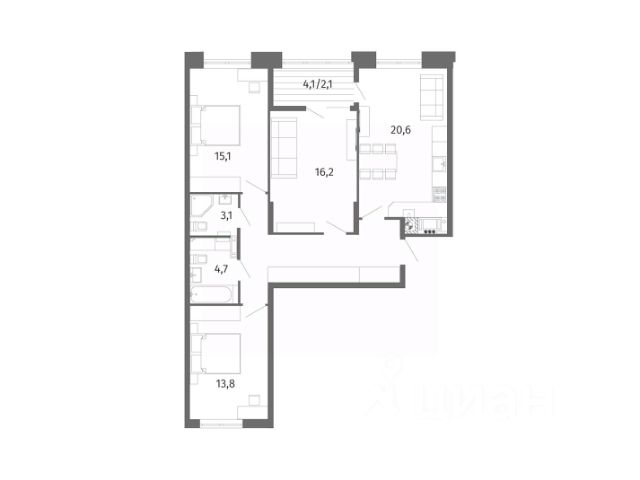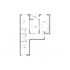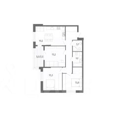 Кухня-гостиная — 39,7 м², Спальня — 18,9 м², Вторая спальня — 16,1 м², Ванная комната — 5,8 м², Гардеробная — 4,2 м² (можно переоборудовать во второй санузел, все выводы есть!), Две лоджии — 2,7 и 3,2 м², Терраса — 21,5 м² с электричеством и розетками, Выход на террасу из обеих спален, Высота потолков — 2,8 м