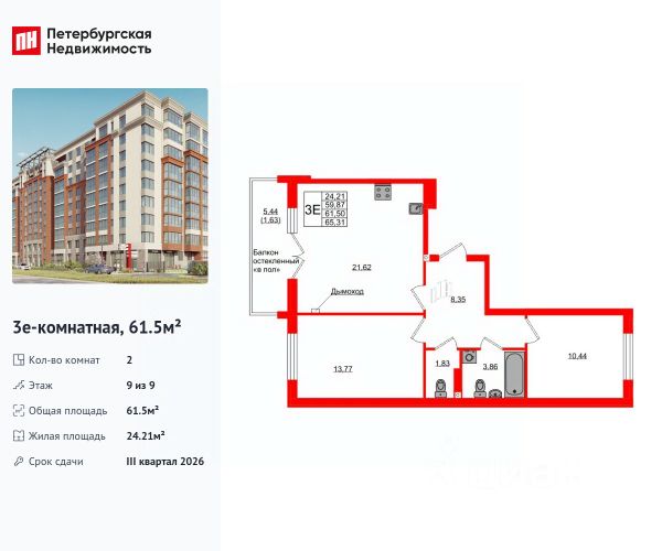 Жилая площадь 31 м2, кухня 24 м2. Площадь комнат: 15/16 м2, предчистовая отделка, совмещенных санузлов - 2.
