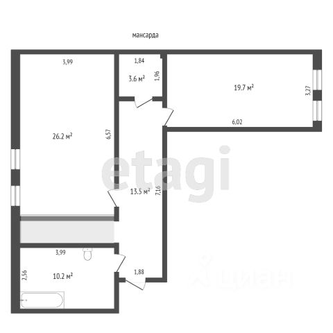 +в двух уровнях (2-й и мансардный этаж). На 1-ом уровне: кухня 9,6м2, изолир. комната 15м2, смежные 14 и 15м2., с/у 4м2, коридор 5м2., лестница на мансардный этаж 25м2.