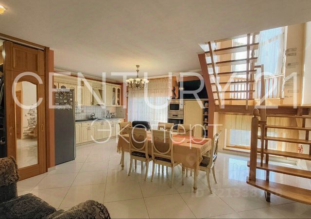 На верхнем этаже квартиры расположены: кухня-столовая, укомплектованная кухонной мебелью, посудомоечной машиной, духовкой, варочной панелью, вытяжкой, каменной раковиной; спальня; гостиная, выполненная в экологичном стиле(обшита деревом) с настенными светильниками; гардеробная ( стеллажи и штанги для одежды); совмещенный санузел с аксессуарами , выложен кафелем. Полы - кафель и ламинат, в зависимости от назначения помещения. Имеются два помещения, приспособленные под лоджию и кладовку.
