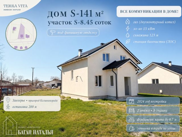 + БОЛЬШАЯ открытая терраса 20м2 () СИСТЕМА РАССРОЧКИ сроком до 2-х лет ПОД СЕМЕЙНУЮ ИПОТЕКУ от 6% И IT- ИПОТЕКУ от 6% В коттеджном посёлке: - Закрытая территория, - Коммуникации центральные - Дорога с твердым покрытием до участка - асфальтная крошка - Забор по периметру участка - Газон на Вашем участке - в подарок от нас ЛОКАЦИЯ: 15 мин до моря по трассе до Зеленоградска на берегу моря 15 мин до Калининграда 4 минут до аэропорта Храброво 2 минуты до лесного массива с грибами и ягодами " На приватной и благоустроенной территории построено Оптимальная площадь домовладений и земельных участков, огороженных красивыми заборами, продуманное расположение коттеджей все это гарантирует жильцам повышенный уровень приватности и комфорта. Коммуникаций и обустройство: — 15 кВт трехфазное электричество — Центральное водоснабжение — Газоснабжение (дополнительные условия) — Ливневая канализация — Фонари освещения — Шлагбаум — Дорога с твердым покрытием - асфальтная крошка — Забор по периметру участка — Красивый ровный ГАЗОН - в подарок от нас В посёлке предусмотрен единый периметр безопасности, въездная группа со шлагбаумом Рядом с поселком находится крупнейший в Калининградской области торгово-развлекательный комплекс Балтия-молл с расположенными в нем один из лучших продуктовых супермаркетов Калининградской области — ЕВРО СПАР, АКОРУС, а также различные рестораны, магазины и кинотеатр, детские комнаты, игровые площадки, строительный торговый центр Лемана ПРО. В непосредственной близости расположены магазины, детский сад, достопримечательности, от нашего поселка ходит школьный автобус в ближайшую школу, запланирован ввод школы в поселке Матросово. Дом в состоянии "Серый ключ", кадастровый номер участка - 39:03:040006:1666;