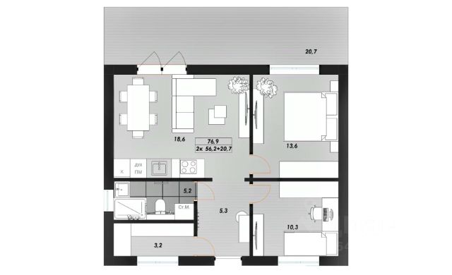 На 2-ом этаже так же есть пространство для рабочего стола, общая зона отдыха: лаунж-зона (24,9кв.м) с возможностью обустройства домашнего кинотеатра.