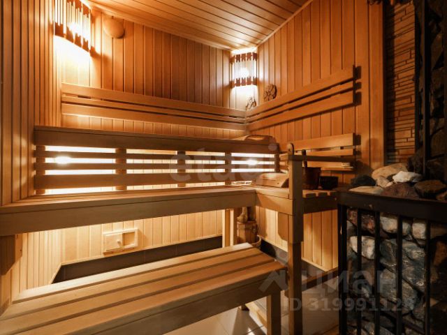 сауна комфортно вмещает шестерых взрослых, так же здесь находится душевая и бассейн. Имеется две комнаты для переодевания, каждая со своим сан.узлом. Из бассейна и из гостиной имеется выход на террасу, где можно посидеть на свежем воздухе, отдохнуть после парилки или насладиться любимыми напитками