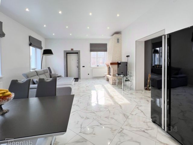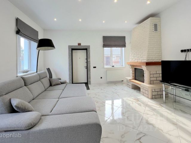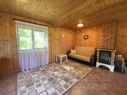 На первом этаже просторные помещения: прихожая (12 квм) с панорамным остеклением. Из неё вход в баню с душем (5.5 квм) и большую комнату 23 квм. Эта комната отделана вагонкой и имитацией бруса. Далее смежная комната - гостиная с камином (16 квм), которая объединена с кухней (9 квм). Здесь стены с отделкой из гипсоплиты. Совмещенный санузел (8 квм) с угловой ванной, есть окно. В коридоре и кухне теплый электрический пол.
