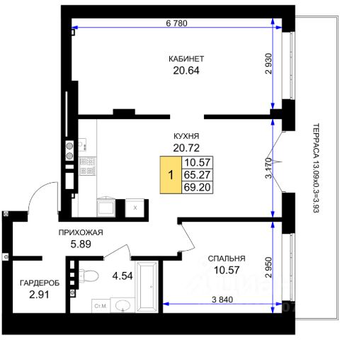 Площадь комнат 13,09+11,46+11,59 кв.м.