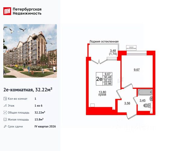 В квартире имеется кухня, площадью 7,1 м2 с выходом на застекленный балкон, просторная комната, площадью 17,7 м2