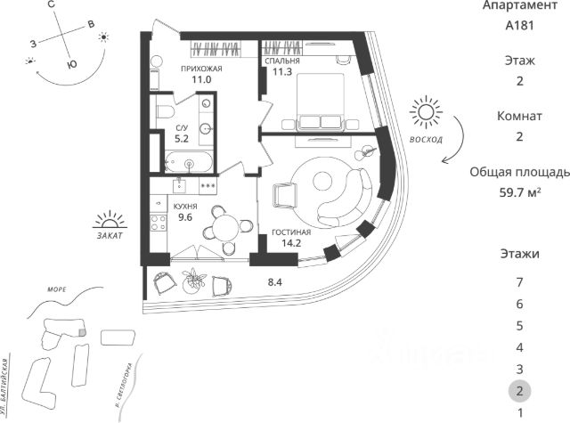 Квартира располагается на 1 этаже 6-этажного дома в ЖК Балтийский берег.