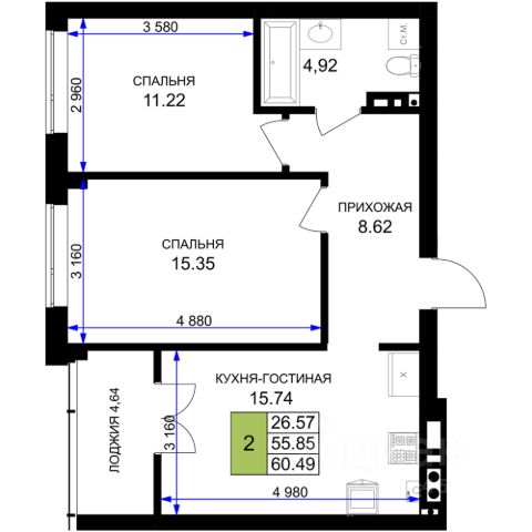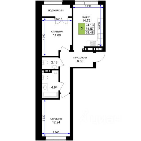 Объект 27. РЕМОНТ ВХОДИТ В СТОИМОСТЬ! Видно ремонта по запросу ставка 3,5% Продам просторную и светлую 2x комнатную квартиру. Общая площадь 58 м2, жилая площадь 26 м2, площадь кухни 12 м2. Второй этаж 9-этажного дома, кирпичный, построен в 2025 г. Раздельный санузел, газовое отопление, грузовой лифт, есть лоджия, качественный ремонт. Подробнее по телефону.