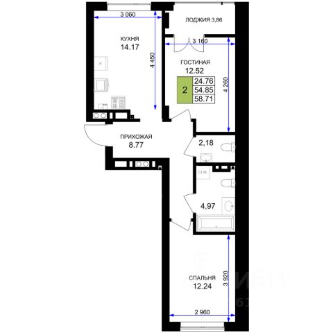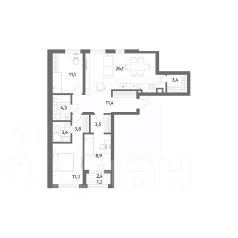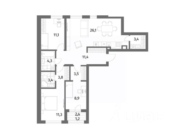 Квартира расположена на втором этаже девятиэтажного дома. В ней сделан евроремонт, комнаты изолированы, а высота потолков в 2,7 метра создаёт ощущение простора. Из окон открываются виды на улицу и двор. Общая площадь квартиры — 96 кв. м, жилая — 58,5 кв. м, площадь кухни — 14,7 кв. м. Есть балкон и лоджия, а также два санузла — раздельный и совмещённый.