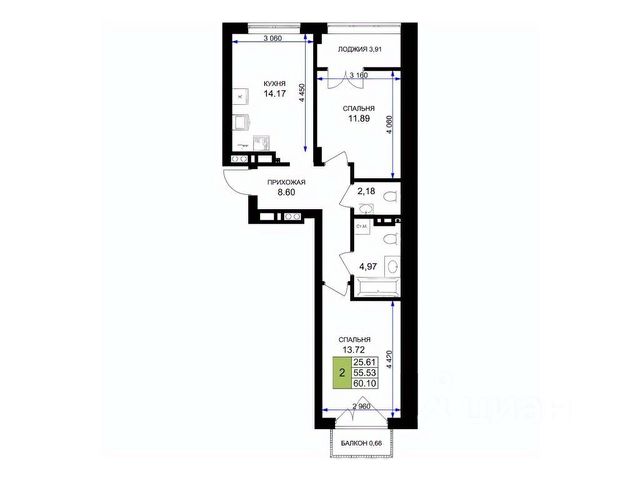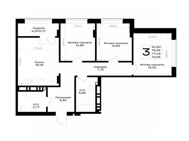- совмещенный санузел — 2,5 кв.м;