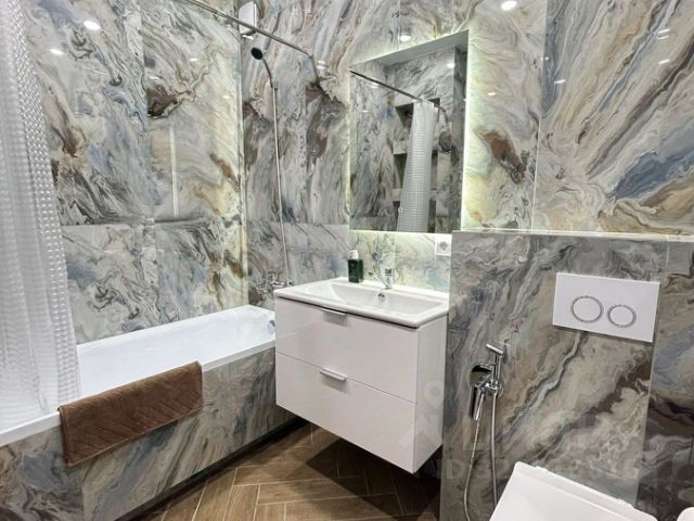 На стадии ремонта, есть возможность увеличить кухню-гостиную с 21,5 м² до 34,8 м², если не понадобится третья комната. Панорамные окна с выходом на широкий балкон 6 м². В планировке можно внести не значительные изменения во входной группе для установки встраиваемого шкафа для верхней одежды. Так же в планировке предусмотрены две гардеробные (2,4; 1,2 м²), ванная комната (5,3 м²) и гостевой санузел (3,1 м²).