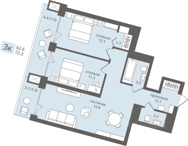 -Лоджия (остекленная - дополнительное пространство для отдыха) 2,1 кв.м.