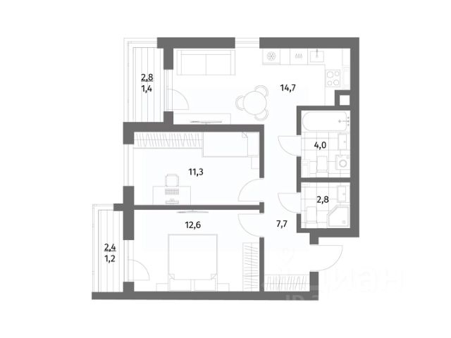 Продается квартира площадью 43.2 м² на 1 этаже 2 секции в River Park от компании ГК "ТРЕСТ". Площадь кухни 14.2 м².