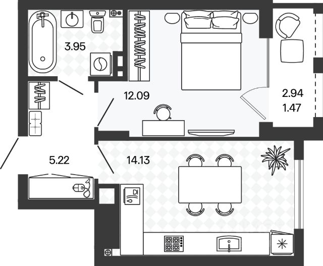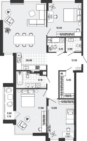 Общая площадь квартиры 67.47 кв. м, продуманная планировка, которая максимально эффективно позволит создать любой интерьер: просторная кухня-гостиная 18.89 кв.м с кабинетом, спальня 12.58 кв.м с выходом на лоджию,  спальня 13.86 кв.м с панорамным остеклением,  гостевой санузел  и ванная комната. Благодаря высоким потолкам и панорамному остеклению все помещения наполняются светом, это создает простор и комфорт для проживания. Автономное отопление. Предчистовая отделка квартиры позволит осуществить любые дизайнерские идеи. Окна квартиры по сторонам света ориентированы  на север и юг.