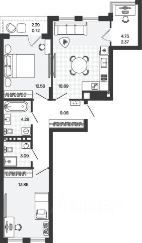 Общая площадь квартиры составляет 41 кв. м, жилая площадь — 13.2 кв. м, а просторная кухня — 15.6 кв. м.