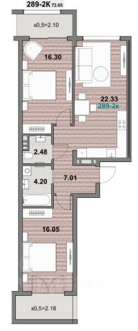 Общая площадь квартиры 52,8 кв.м, площадь кухни 11,05 кв.м., комнаты 16,92 кв.м., с/у 5,31 кв.м., коридор 8,38 кв., балкон-терраса 11,0 кв.м.