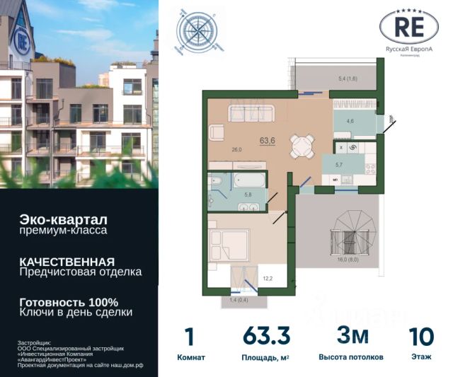 Прямая продажа от застройщика! Готовность проекта - 100%. Ключи сразу после сделки! Впечатляющая квартира с предчистовой отделкой, потолками 3 м и панорамным видом на парк. ЭКО квартал "РусскаЯ ЕвропА" — это современное пространство для жизни, состоящее из монолитно-кирпичных зданий переменной этажности. Застройщиком представлены разнообразные планировки квартир: от уютных студий до просторных четырехкомнатных квартир, включая двухуровневые решения и европланировки. Квартиры сдаются в предчистовой и чистовой отделке Особенности ЖК "Адрес Счастья" ЭКОквартала "Русская Европа": Проект комфорт-класса в престижном Ленинградском районе города; Ультрасовременные экологические инженерные решения в каждом доме и каждой квартире; Элегантное решение композиции фасадов от архитектурного бюро с мировым именем и две победы на международных архитектурных премиях URBAN AWARDS; Впервые в Калининграде lounge-зоны на крышах домов; Европейский подход к благоустройству: площадь с фонтанами, ландшафтный парк, детские и спортивные площадки; Панорамное остекление квартир поражают своими головокружительными видами на архитектуру комплекса и зеленые виды парков; Продуманная концепция инфраструктуры: Школа, детский сад и поликлиника на территории комплекса, уютные кафе и рестораны, супермаркет, фитнес-студия, службы сервиса, детский центр развития. Транспортная доступность: Удобный выезд на Московский проспект, улицу Гагарина и Большую Окружную; В пешей доступности Суздальский парк и городской парк ДЕВАУ Квартира с предчистовой отделкой Качественная предчистовая отделка позволит проявить творческий подход к созданию уникального дизайна квартиры, а все черновые работы, включая установку внутренних перегородок, разводку электричества и мокрых точек уже будут выполнены. Каждая квартира отличается особыми преимуществами и подготовлена к системе умный дом: - Панорамные окна от потолка до пола; - Собственная терраса; - Мастер спальня; - Гардеробная; - Дополнительная, сверхнормативная шумо/гидроизоляция стен и перекрытий - Индивидуальная приточно-вытяжная вентиляция с фильтрацией и рекуперацией Официальный отдел продаж проекта "Русская Европа" предлагает своим клиентам специальные условия приобретения квартир в рамках программ ипотечного кредитования от банков-партнеров. Больше подробностей о квартирах жилого комплекса "Адрес Счастья" и уникальное предложение для вашего бюджета - по телефону отдела продаж! Звоните!