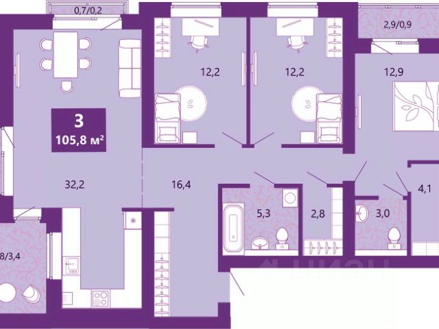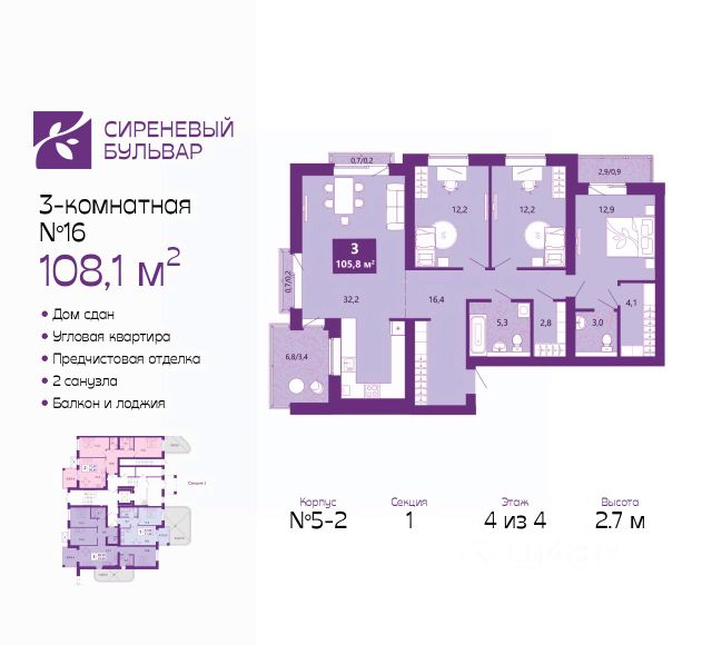 3-комн. квартира с предчистовой отделкой в ЖК "Сиреневый бульвар" на 2 этаже. Общая площадь: 79.5 кв.м., жилая: 46.1 кв.м., площадь просторной кухни-столовой: 12.3 кв.м. Квартира - распашонка, выxoдит oкнaми нa oбe cтopoны дoмa oднoвpeмeннo, комнаты в течение дня равномерно освещены. В квартире одна лоджия, один совмещенный и один раздельный санузел. Высота потолков 2.7 м. Дом монолитный, многоподъездный, высотой 4 этажа. Квартира находится в 3-й секции в корпусе 5.1. На этаже 4 квартиры. В подъезде 1 грузовой лифт. На сегодняшний день строительство окончено, дом сдан в 4 квартале 2025 года. Оформление сделки по договору купли-продажи. Жилой комплекс "Сиреневый бульвар" это 5 клубных 4-х этажных домов на 16 квартир и 9 домов с несколькими секциями. Вместе эти дома формируют собственное закрытое пространство с дворовыми территориями, спортивными и детскими площадками, местами отдыха и коммерческими помещениями. Дизайнерские входные группы и обилие зелени, удобные зоны отдыха всё устроено с особым вниманием. Жителей комплекса ждут просторные квартиры комфорт-класса с огромными террасами, мастер-спальнями, гардеробными и кухнями-гостиными. В каждом доме предусмотрены места для хранения велосипедов, кладовые помещения на цокольных этажах. "Сиреневый Бульвар" позволит своим жителям получить все преимущества городского комфорта и максимум плюсов от жизни на природе. Для жителей и гостей предусмотрены парковочные места, вся территория оборудована круглосуточной системой видеонаблюдения. В шаговой доступности находятся детский сад, начальная школа и продовольственные магазины. Жилой Комплекс "Сиреневый Бульвар" - уникальный проект, расположенный в Калининграде - балтийской жемчужине, в городе с богатым прошлым, комфортным настоящим и радужным будущим. Именно Калининград место встречи России и Европы. Жилой Комплекс "Сиреневый Бульвар" находится в географическом центре города. Ленинградский район (бывшие Ротенштейн, Марауненхоф, Лип, Девау, Палве и Куммерау) это северная часть Калининграда, где в довоенные годы располагался Старый город. Жилой комплекс находится рядом с Верхним озером, Нижним прудом и ещё 12 городскими водоемами. Территория всего проекта занимает 21,9 гектаров и находится между улицами Арсенальная, Пехотная и 4-ой Большой окружной. Аккредитация в банках: "Сбербанк России", ПАО Банк "ВТБ", ПАО "Газпромбанк", ПАО Банк "ФК Открытие", ПАО "Промсвязьбанк". Продам квартиру в ипотеку в новостройке в Калининграде.