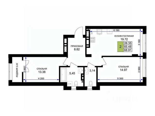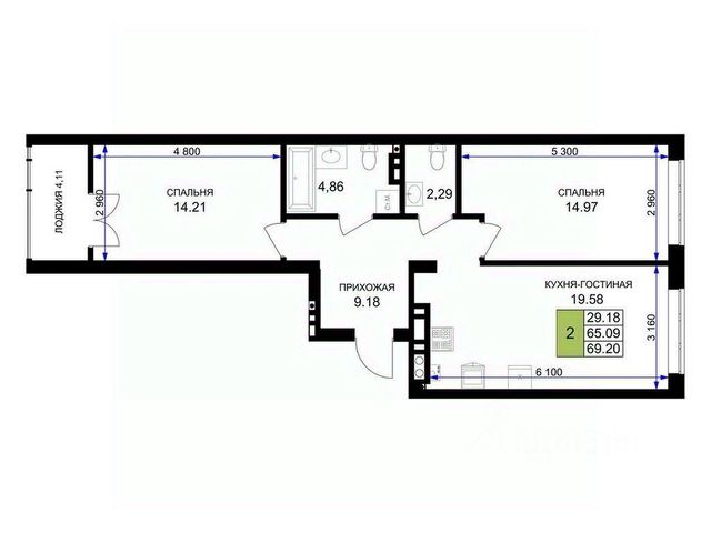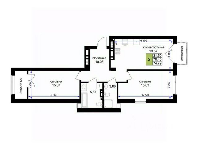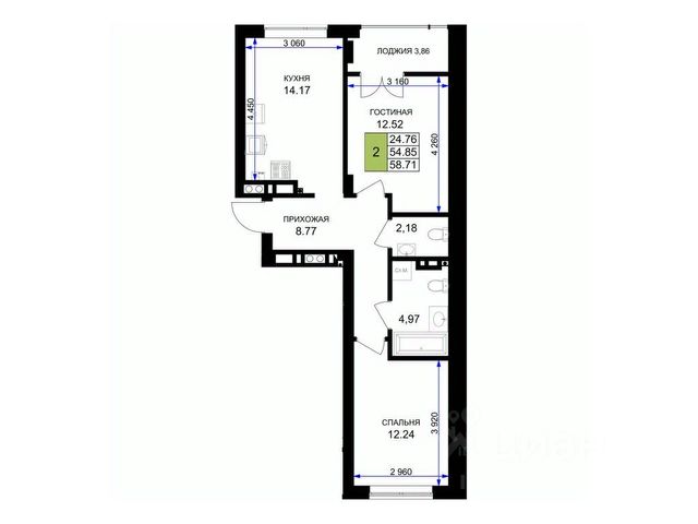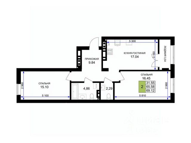 Лоджия 3,6 кв м ,Сан узел совмещен 5,2 кв м.