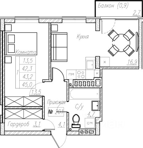 Квартира: 1 к 43,33 кв.м., 1 этаж в комплексе Резиденция, 1 очередь, корп.1, сдача: 2кв. , этажей: 5, адрес Пионерский г., Комсомольская ул., д. 19, Застройщик: Зеленый Город.