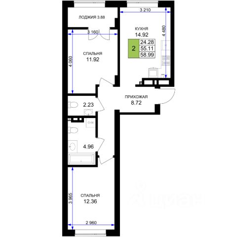Общая площадь квартиры составляет 54,6 кв м: три комнаты - 13,3, 11,1 и 8,6 кв м, кухня 8,6 кв. м, холл 8,0 кв м, раздельный с/у, застеклённая лоджия 2,7 кв м.