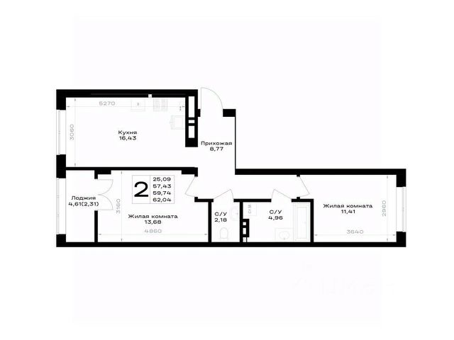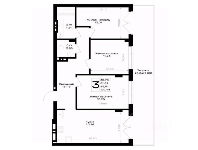 Общая площадь квартиры 53 кв.м.
