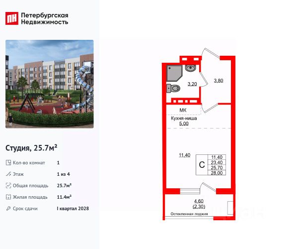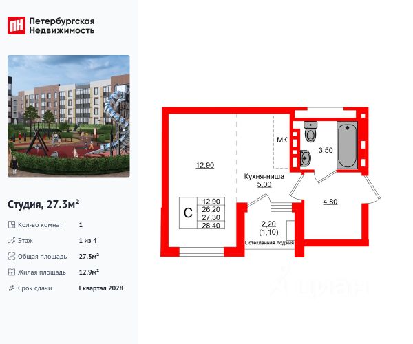 Продается просторная студия от застройщика в жилом комплексе "Кроны и Волны" в Зеленоградск. Удобная, классическая, функциональная европланировка, большая кухня-гостиная 5 м², просторная прихожая 4.3 м². Общая площадь студии - 26.5 м², жилая 7.2 м², высота потолка 2.7 м. Квартира продается с отделкой "Серый ключ КиВ". Что особенного в ЖК "Кроны и Волны"? • Современный малоэтажный жилой комплекс • Дизайнерские детские площадки, зоны для спорта и активного отдыха, велодорожки • Помещения для колясок и велосипедов в каждой парадной • Неповторимые лесные пейзажи в непосредственной близости к побережью Балтийского моря • Концепция "Двор без машин"